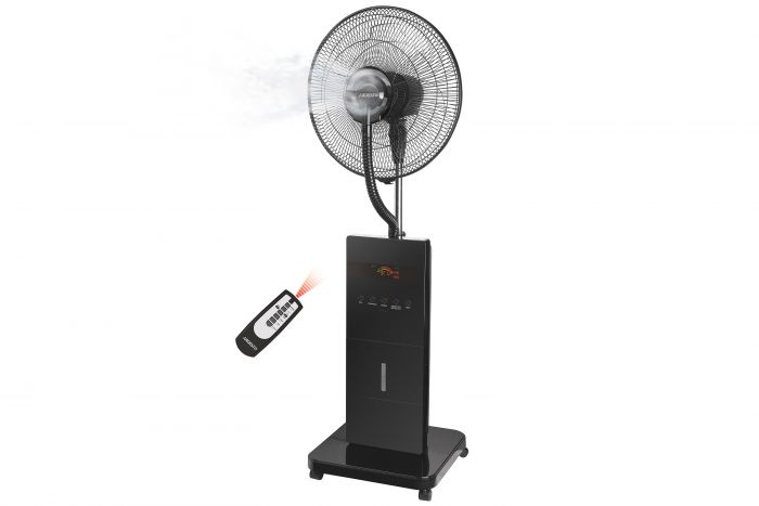 Вентилятор підлоговий чорного кольору з функцією зволоження, іонізацією та захистом від москітів. Для зручного керування передбачено дисплей з кольоровою індикацією та пульт ДУ. Модель виконана з надійних, практичних і довговічних матеріалів, а в якості підставки використовується платформа з колесами.