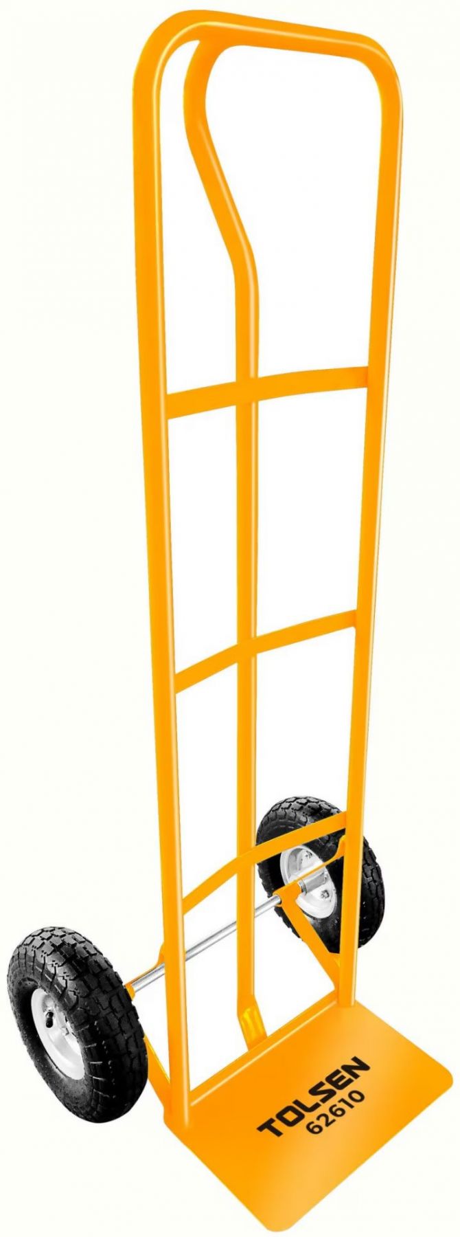 Універсальний вантажний візок Tolsen із вантажопідйомністю до 200 кг оснащений платформою 35 × 22,5 см (товщина 3,5 мм) та пневматичними колесами 10" × 3,50-4 для плавного руху на нерівних поверхнях. Рама з трубчастої сталі забезпечує міцність і довговічність. Габарити візка: 1310 × 550 × 460 мм. Ідеально підходить для транспортування вантажів удома, на складі або будівництві.