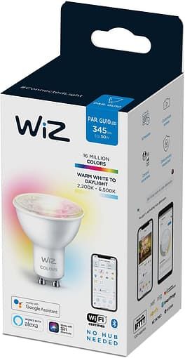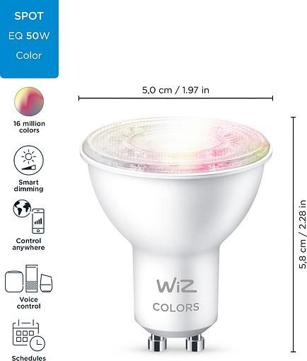 Керована по WiFi лампа WiZ GU10 4,7W(50W 400Lm) 2200-6500K RGB Wi-Fi. Потужний RGB LED для яскравого і насиченого кольорового освітлення, створить приємну атмосферу і прикрасить ваш будинок. Широка колірна гамма забезпечує найбільш відповідне освітлення для вашого повсякденного життя. Для концентрації і підвищення продуктивності використовуйте холодне світло, а для того, щоб розслабитися і приємно провести час - м'яке тепле біле світло.