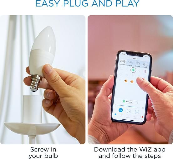 Керована по WiFi лампа WiZ E14 4.9W(40W 470Lm) C37 2700K з затемненням, Wi-Fi. Розумне затемнення за допомогою додатку або голосу. Не потрібно встановлювати дорогий димер. Тепле біле світло створює приємну і затишну атмосферу дома. Установіть вмикання світла на певний час, щоб він вмикався, коли ви повертаєтеся додому і автоматично вимикався, коли всі пішли з дому.