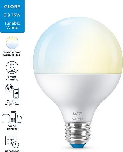 Керована по WiFi лампа WiZ E27 11W(75W 1055Lm) G95 2700-6500K Wi-Fi. Відтінки білого. 2700-6500К LED лампи. Широка колірна гамма забезпечує найбільш відповідне освітлення для вашого повсякденного життя. Для концентрації і підвищення продуктивності використовуйте прохолодне світло, а для того, щоб розслабитися і приємно провести час - м'який теплий білий колір.