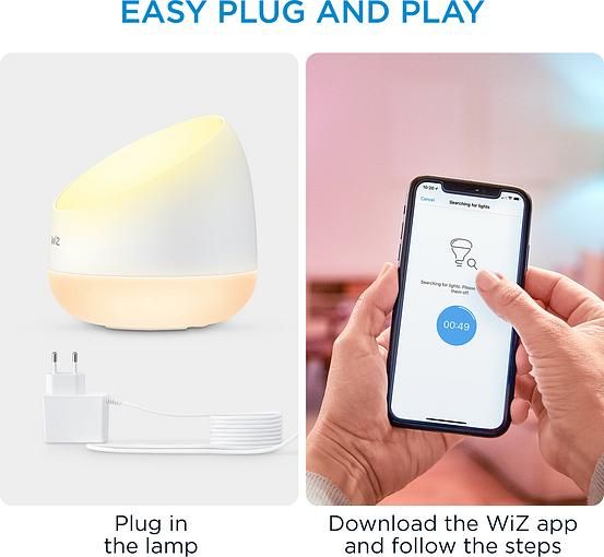 Портативна. Миттєва готовність до використання. Управління із будь-якого місця. Регульований теплий та холодний білий колір, а також заздалегідь задані режими. Подаруйте розумне світло у будь-який куточок вашого приміщення за допомогою настільної лампи WiZ Squire, яка освітлює стіни барвистим світлом. Використовуйте з WiZ або своїм голосом, щоб затемнити і зробити яскравіше, або використовуйте встановлені режими освітлення в налаштуваннях Wi-Fi.
