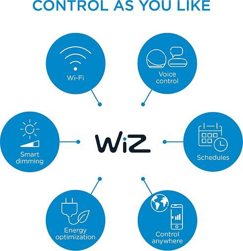 Особливості:Wi-Fi, регулюється лише за допомогою смарт-пристрою або пульта дистанційного керування WiZ