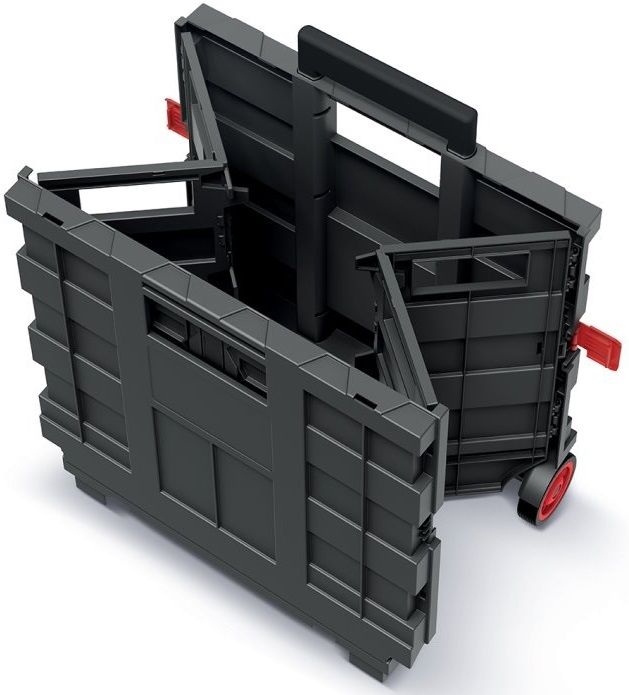 Зручний і компактний складний ящик для інструментів з телескопічною алюмінієвою ручкою. Оснащений колесами з еластомірним покриттям для легкого транспортування. Вантажопідйомність до 25 кг.