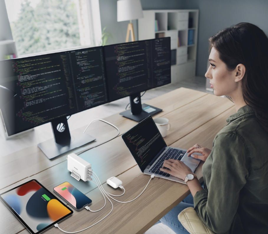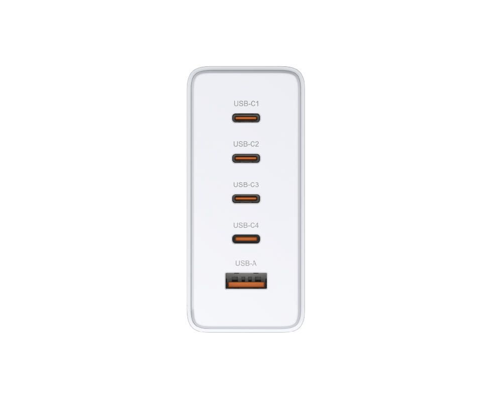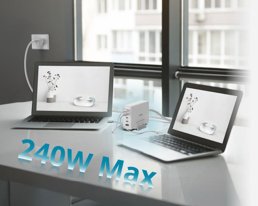 Компактний зарядний пристрій з технологією GaN забезпечує потужність до 240 W для одночасного заряджання до 5 пристроїв. Оснащений чотирма портами USB-C і одним USB-A, має інтелектуальну систему розподілу потужності та підтримує стандарти PD 3.1 і QC 4.0. До комплекту входить зручна підставка. Є захист від перегріву, перенапруги, короткого замикання та перезаряду.