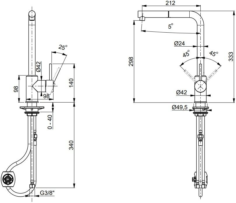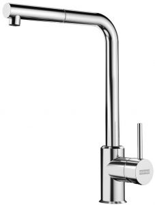 Кухонний змішувач з поворотним витяжним виливом і бічним важелем керування. Витяжний вилив дозволяє зручно мити всю поверхню мийки та наповнювати посуд, який розміщений поза її межами. Кут повороту виливу складає, 360° тому водяний потік досягає більшої площі мийки, а також такий змішувач можна монтувати в острівні кухні.
